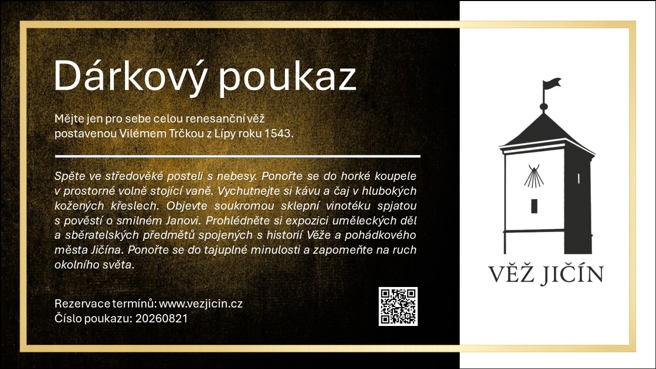 Give your loved ones a romantic escape at the Jičín Tower. Our electronic gift vouchers arrive instantly, ready to use, and make an ideal present for Christmas, birthdays, anniversaries, or any special occasion. Each voucher is valid for one year from the date of issue, and the recipients can choose their own stay dates. Simply fill in your contact details and select the length of stay (prices are the same as for reservations). You may also add credit for the cellar wine bar or include any special requests.